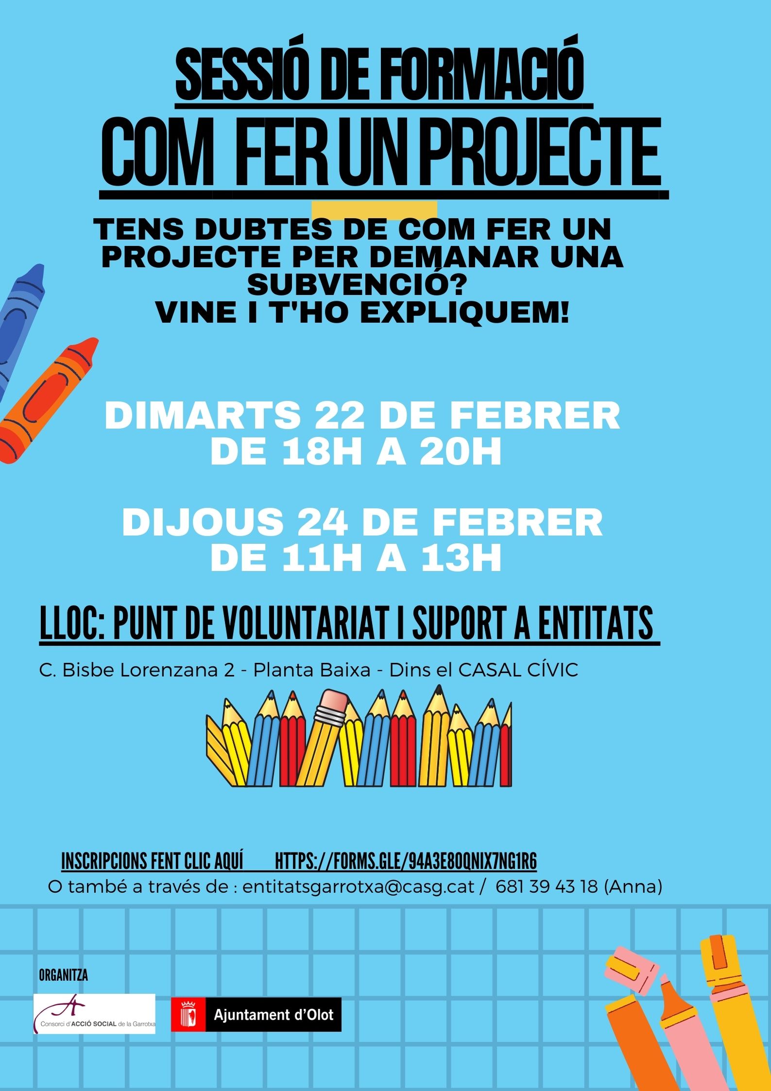 La formació es farà en format presencial al Punt de Voluntariat i Suport a Entitats ubicat al carrer Bisbe Lorenzana, 2 ( dins al Casal Cívic- Planta Baixa). Els horaris seran el dimarts 22 de febrer de 6 a 8 de la tarda o el dijous 24 de febrer de 11h a 13h del matí. Podeu fer les inscripcions a través de l’enllaç https://forms.gle/ZPaZG7KADRac6ZAA7 o bé escrivint un correu electrònic a entitatsgarrotxa@casg.cat.