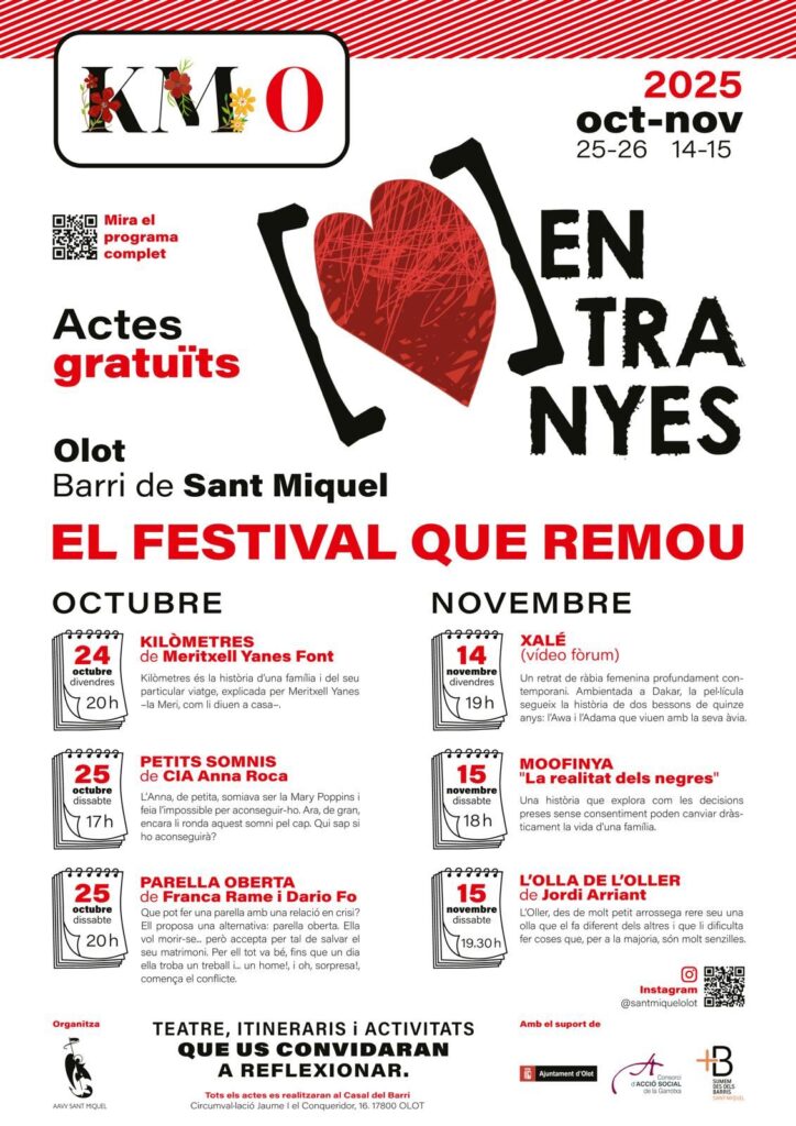 Durant dos caps de setmana d’octubre i novembre se celebra la setena edició del festival. Aquest any amb un total sis propostes km0, per reflexionar i dialogar amb consciència social. Entranyes és una de les accions del Consell de Barri de Sant Miquel – les Tries en el marc del Pla Integral d’Accions de Millora.