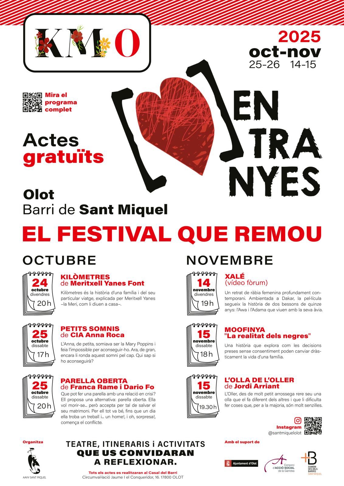 El festival es durà a terme els caps de setmana del 24 i 25 d’octubre i del 14 i 15 de novembre, totes els actes són gratuïts i es realitzaran al Casal de barri de Sant Miquel. L’actriu Meritxell Yanes obrirà el festival amb l’espectacle Kilòmetres, la història d’una família i el seu particular viatge el 24 d’octubre a les 20h del vespre. Entranyes continuarà el mateix cap de setmana amb dues propostes més: