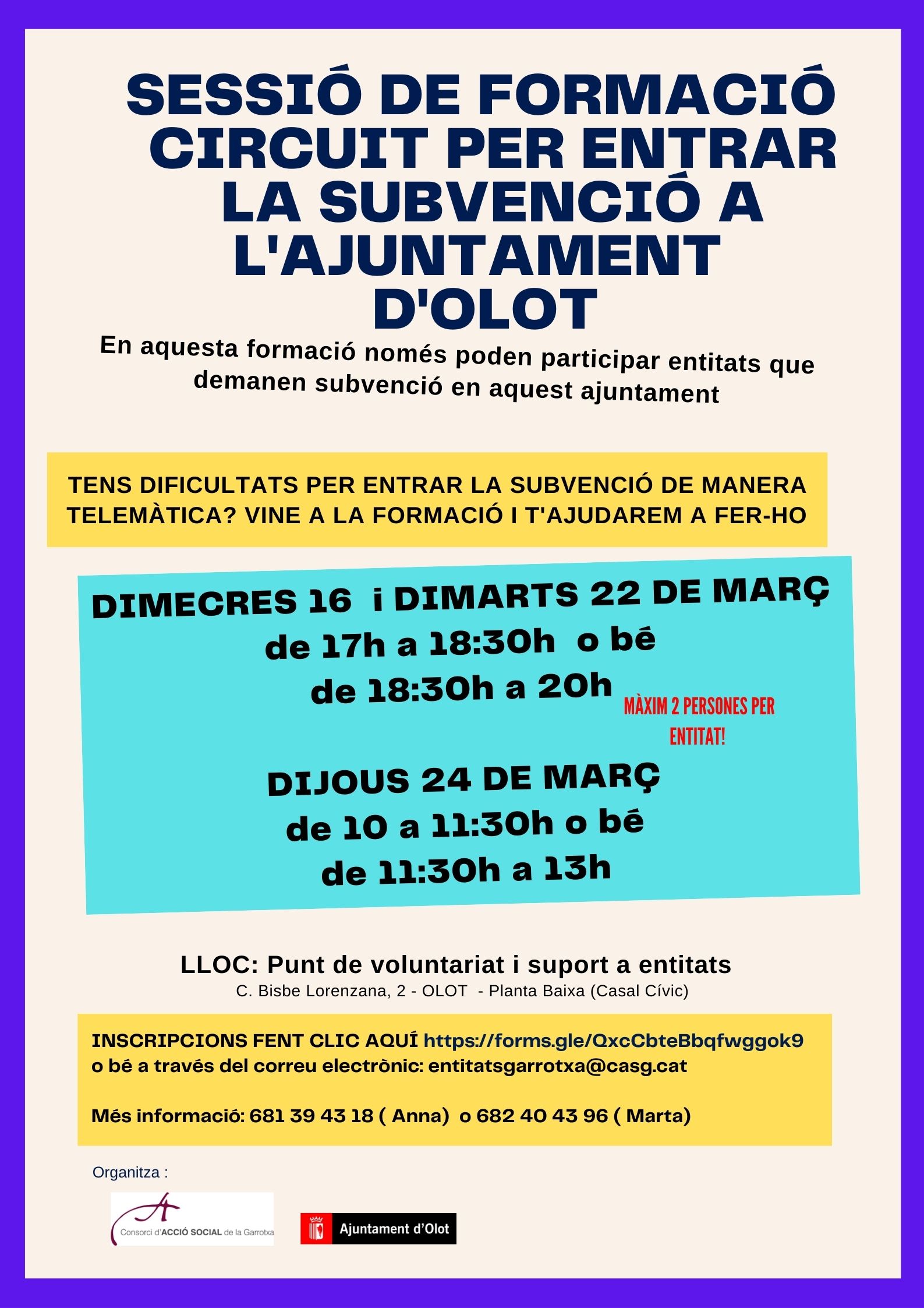 La formació es farà en format presencial al Punt de Voluntariat i Suport a Entitats ubicat al carrer Bisbe Lorenzana, 2 ( dins al Casal Cívic- Planta Baixa). Els horaris seran el dimarts 15 i 22 de març de 17h a 18:30h o bé de 18:30h a 20h. També es podrà participar el dijous 24 de març de 10h a 11:30h o bé d’11:30h a 13h. Podeu fer les inscripcions a través de l’enllaç https://forms.gle/rHgWNA5VH5g4SE2F9 o bé escrivint un correu electrònic a entitatsgarrotxa@casg.cat.