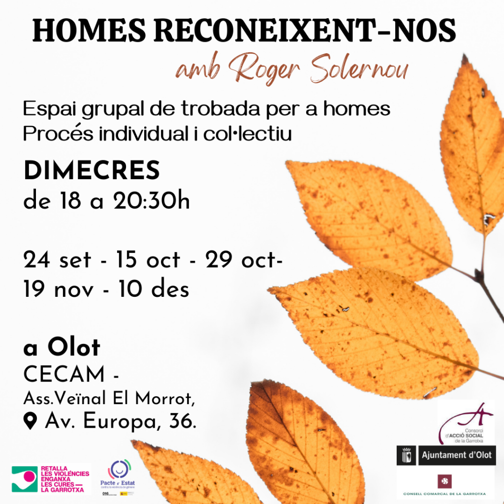 Aquesta és una iniciativa dirigida a homes a qui els interessi participar en un procés grupal de trobada des del qual abordar la seva vivència de ser homes i la masculinitat atribuïda a aquest fet. Són iniciatives gratuïtes amb places limitades que es duran a terme a Olot els dimecres de tardor de 18 a 20:30h.